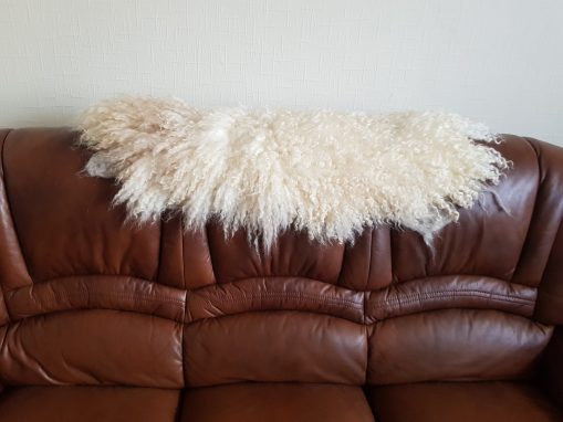 I made this seat pad from a lovely white Wensleydale fleece. This piece of Wensleydale is very soft, with Jacob fleece used on the back. The locks are very shiny and soft. The seat pad could be used to provide a soft warm natural textured support, or as an ornamental enhancement to your existing décor.