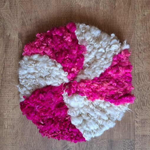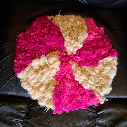 Experience the unparalleled warmth and coziness of our thick, luxurious round Masham sheep fleece seat pad or pet mat. Made from the dense, curly locks of Masham sheep, this fleece pad features a stunning spiral effect created with natural cream and hand-dyed pink locks, making each piece truly one-of-a-kind.