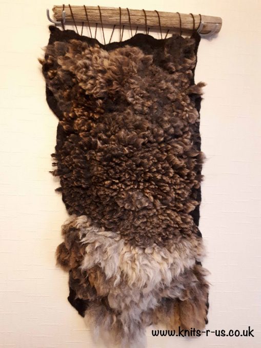 I made this unique piece of wall art from 2 different fleece. I made the top part with some Zwartble brown fleece and edged the bottom with some left over Dora, the telex mule fleece. All the wall art pieces will always be unique, as even next years fleece from the same sheep will have changed colour and staple length. Dora was a Texel mule, she had a fantastic fleece, I made several items from Dora’s fleece, a rug and a wall art.