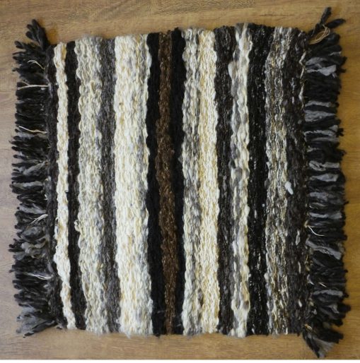 This peg rug is made from a wide variety of fleece. When I first started exploring washing and spinning fleece I tried out a wide variety of fleece. I made this peg rug with my spun fleece. It is very heavy and has an array of colours. I washed the fleece, carded it, then spun it and use the clean yarn to make this peg rug.